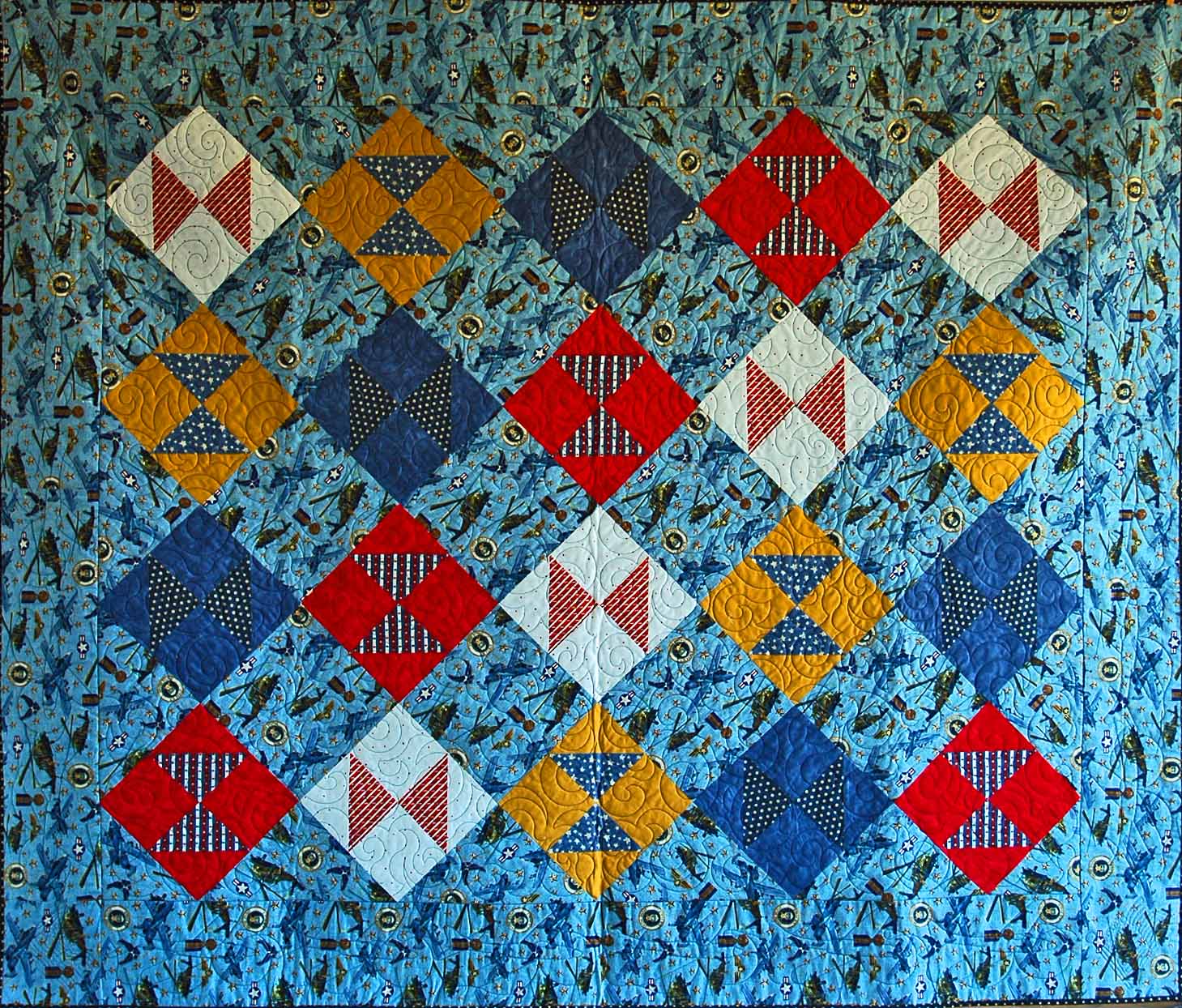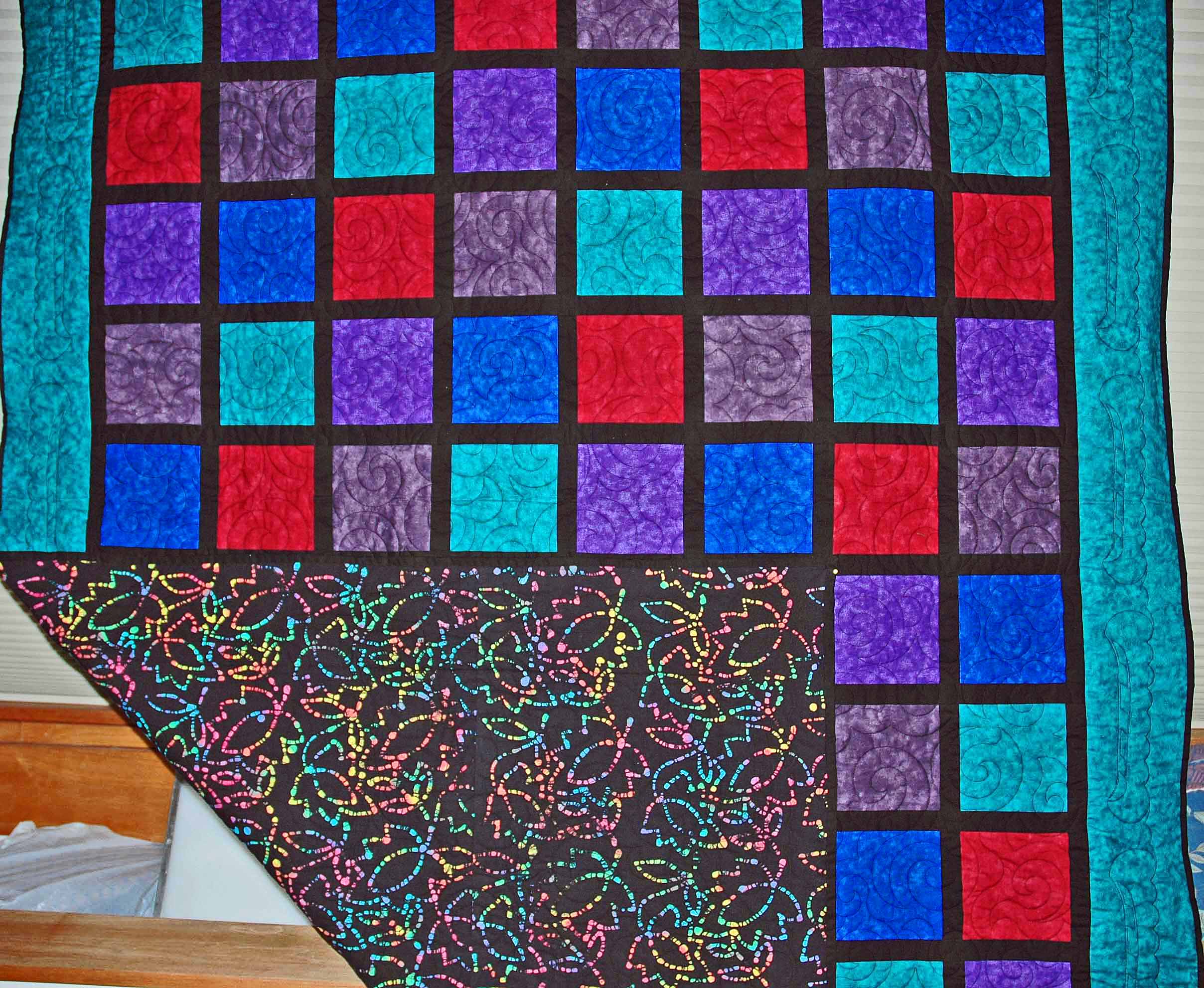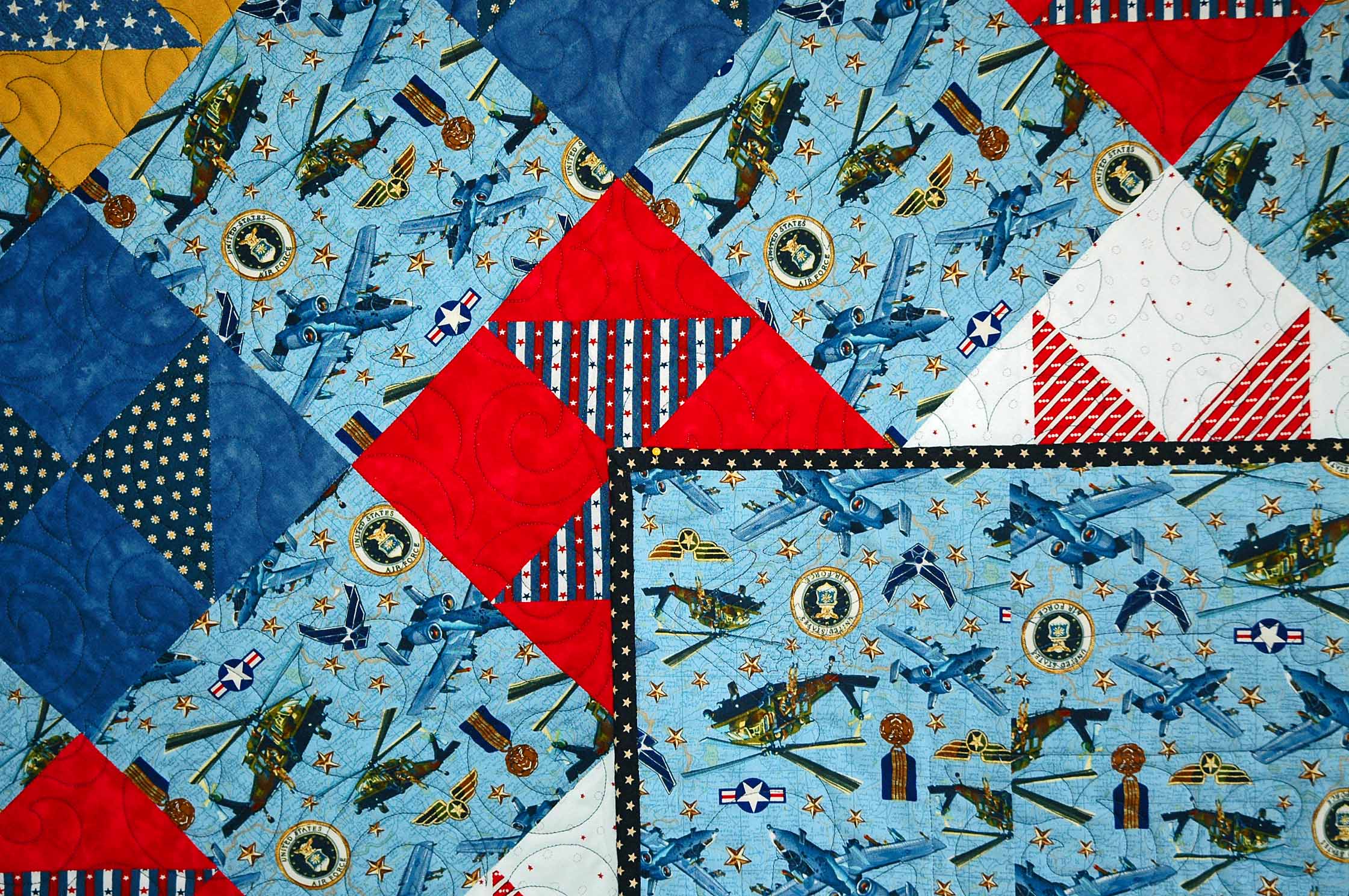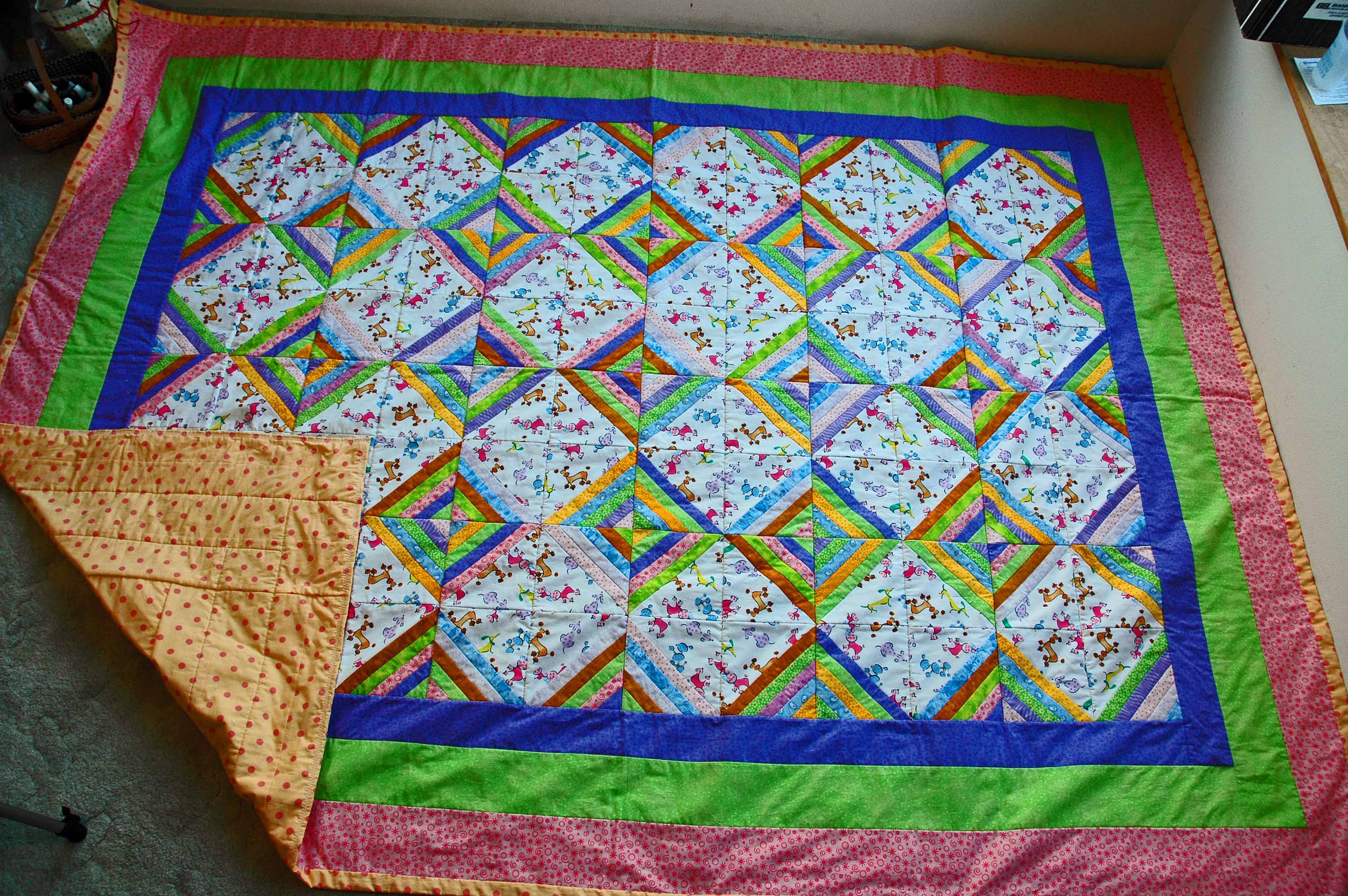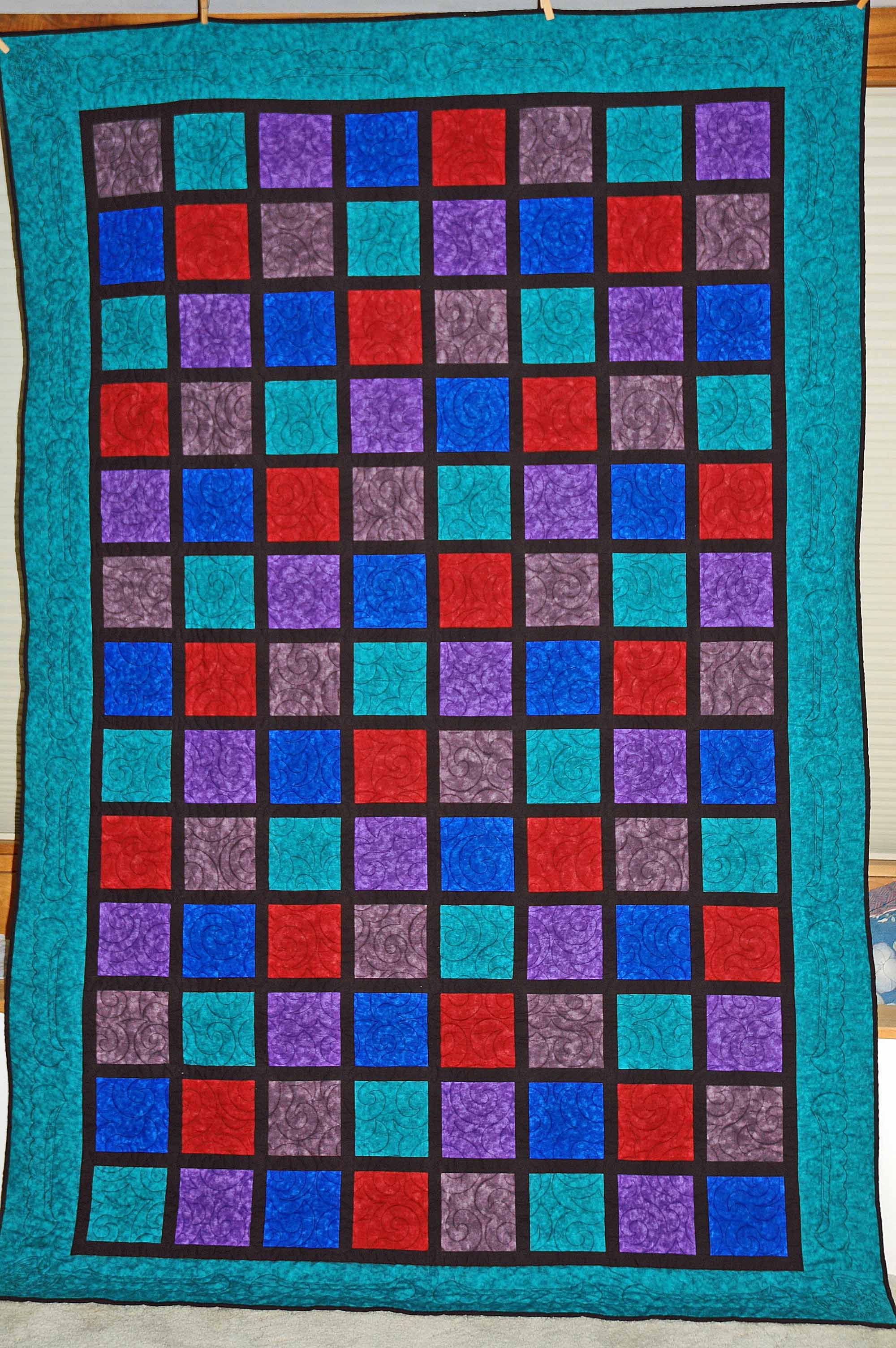 Rosalee has been enjoying the building of quilts for over a decade and for various people. This is a sample of the quilts that she has made, and these have all been given to her grandchildren. They are beautiful keepsakes. Others will be added as they are available (quilts not grandchildren). She cuts and 'pieces' the top of the quilt together and then sews it on her sewing machine. She usually has a lady with the proper machine put the quilt together (top side, filling, reverse side), and then Rosalee finishes up by putting the binding on by hand. In most of the images there is one image that shows her choice of fabric for the reverse. Fabric colors are usually chosen to match the recipients' colors of their rooms. |